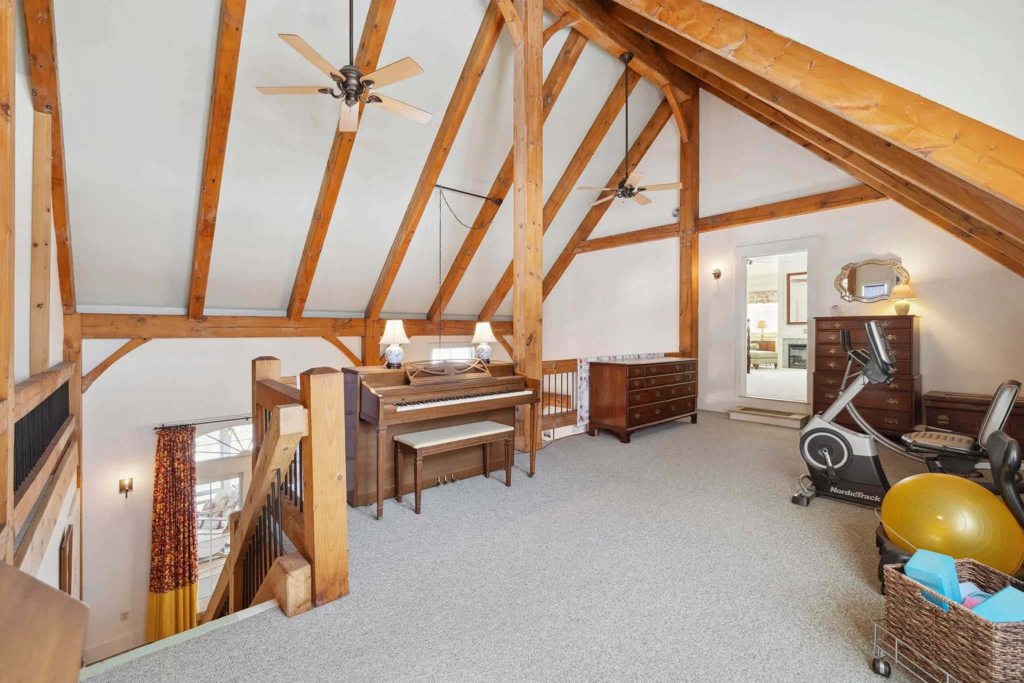 118 GILLS ROAD - Nestled on 13.8 acres of rolling woodland and open field, this property is sited at the beginning of a dead end road, ensuring peace and privacy, yet is only a stone's throw from (and has frontage on) paved North Road. A spacious mud room leads to an open kitchen with soapstone countertops and a dining area with wood stove and cathedral ceilings showcasing the post and beam construction of the original 2003 build. A 3-season sun room with screens for summer brings the outdoors in. The dining area leads seamlessly to the heart of the home, an addition thoughtfully completed in 2018 comprising a family room with large windows, gas fireplace and coffee nook w/ wet bar. On the opposite end of the house, you'll find a wonderful 1st floor bedroom suite with 3/4 bath with roll-in shower, bedroom, and sitting room. The 1st floor also has a 1/2 bath and laundry. The main staircase leads to an open loft perfect for game room or exercise space, an office, and 2 bedrooms that share a 3/4 bath. The primary bedroom can be accessed from the loft or from a separate set of stairs and features a full bath with shower and separate soaking tub and a walk-in closet. The functional basement can be used as a workshop or storage area. An attached 2 bay garage and a carport round off the main structure. Outside, you'll also find a handy garden shed and 5-bay barn. The grounds feature mature plantings, maples, stone walls, field, and a small brook. Easy access to skiing, Silver Lake, and Woodstock.